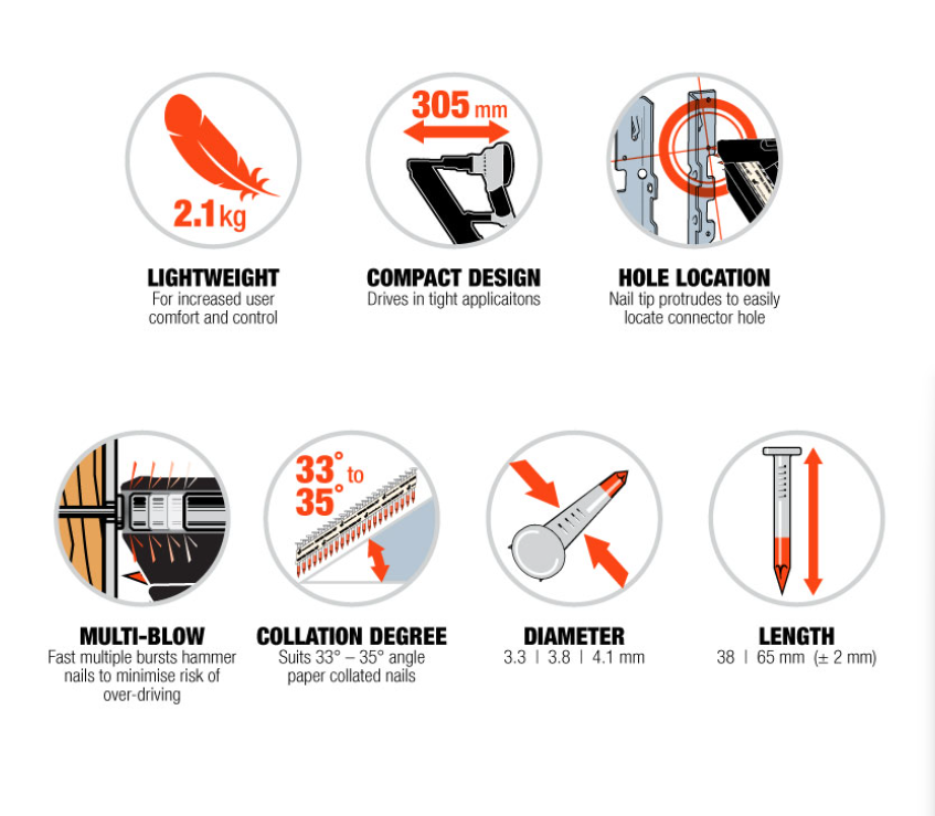 The CCN64 Collated Connector Nailer helps to ensure the correct installation of connectors through its unique design and is considerably faster than traditional hand nailing. The CCN64 has been designed so that connector nails protrude from the tip of the tool. This allows the user to easily locate the tip of the nail into the connector hole so that the connector will not be damaged. The nails are hammered into the timber via multiple blows which prevents the nail from being overdriven.